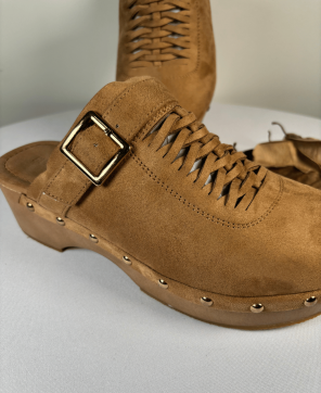 Zueco KALESIS ESPIGA - Color Camel, Con Suela de Madera y Detalle Central